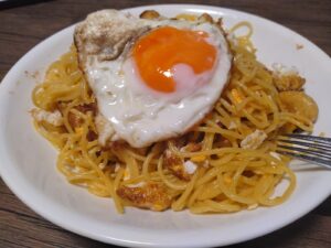 パスタの上に卵(目玉焼き)を乗せるって感じのパスタですが、実はイタリアのナポリ地方の家庭では長年愛されておりまして、現地では『スパゲッティ・アッラ・プヴェリエッロ』と呼ばれているみたいです!
