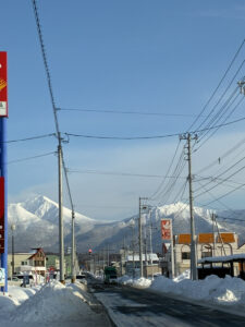 北海道のコンビニ、セイコーマートに後ろにはデッカイ山々!